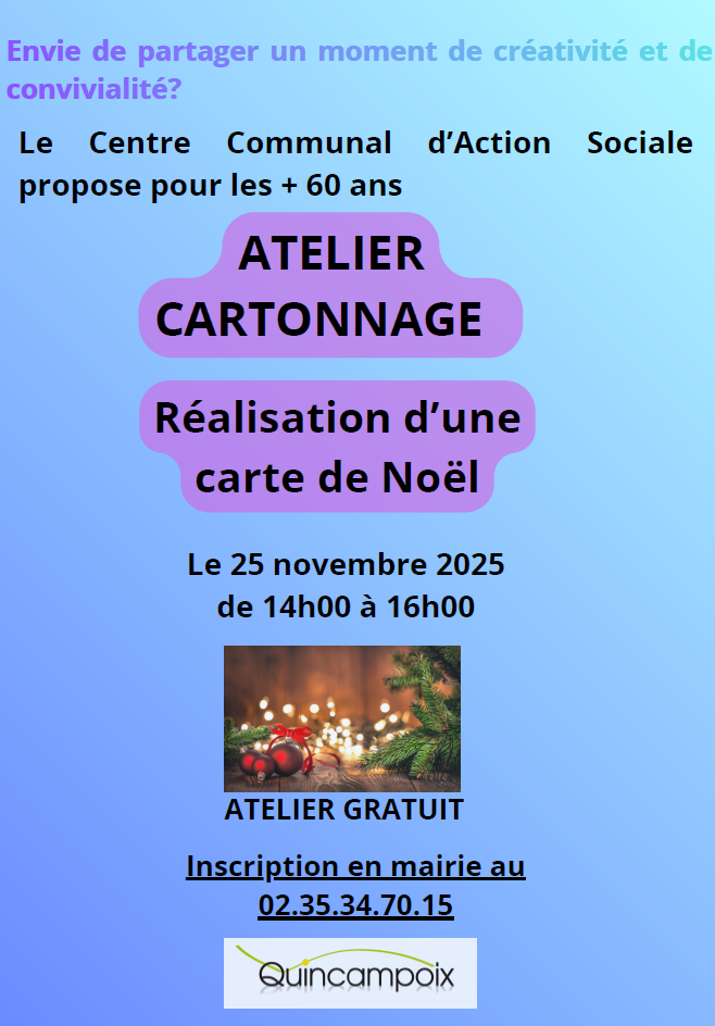 25/11/2025Vous avez 60 ans et plus et envie de partager un moment de créativité et de convivialité ? Inscrivez-vous ! Le CCAS de Quincampoix vous propose de participer à un atelier de cartonnage gratuit le mardi 25 novembre 2025, de 14h à 16h, afin de confectionner une carte de Noël ! Inscrivez-vous dès aujourd’hui à…