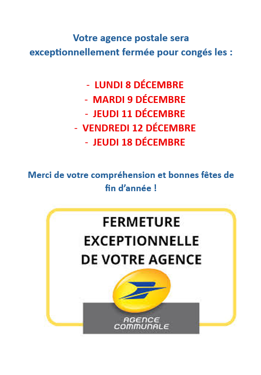 08/12/2025 >18/12/2025Votre agence postale communale ferme pour congés ! Votre Agence Postale Communale sera exceptionnellement fermée pour congés les Merci de votre compréhension. Restez informés Rejoignez nous sur les réseaux sociaux et nos outils de communications.