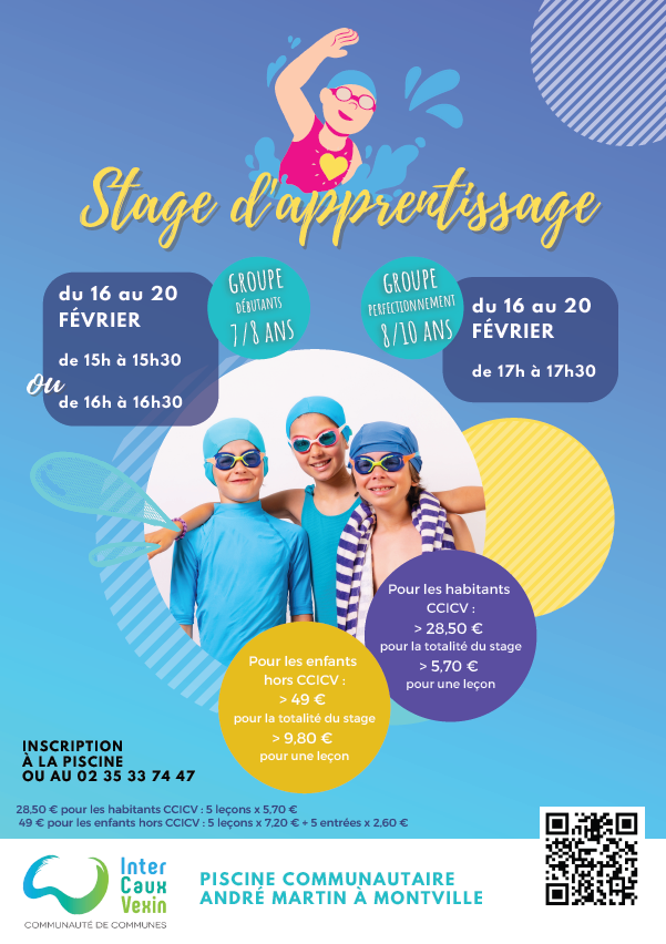 16/02/2026 >20/02/2026Durant les vacances scolaires, du 16 au 20 février la piscine communautaire André Martin vous propose des stages d’apprentissage de la natation. Groupe Débutants 7/8 ans Groupe Perfectionnement 8/10 ans Tarifs du stage : Pour les enfants habitant la CCICV : – 5,70 € pour une leçon – 28,50 € pour la totalité du stage…