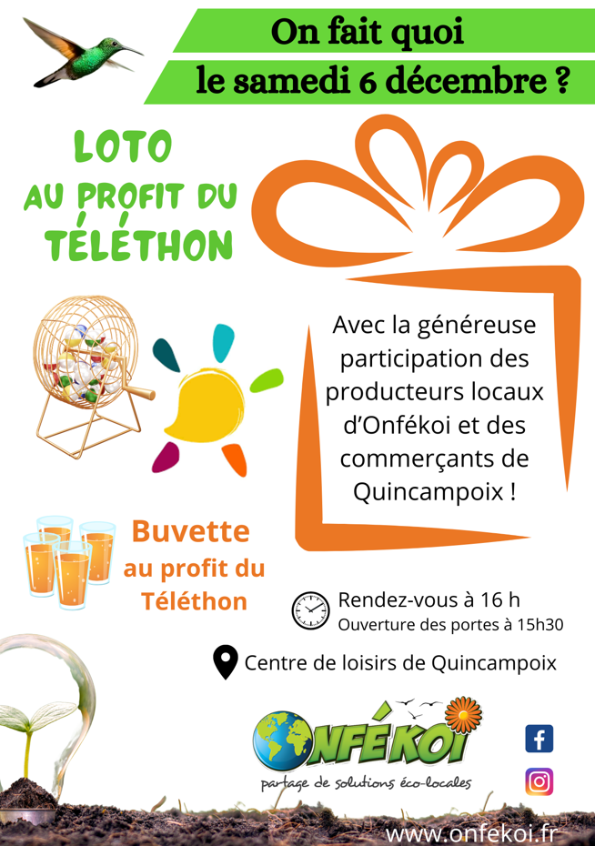 06/12/2025Toutes les recettes de la journée seront reversées au profit du Téléthon ! L’association Onfékoi se mobilise et proposera un loto le samedi 6 décembre au Centre de Loisirs à partir de 15h30 ! De nombreux lots sont à gagner grâce à la généreuse participation des producteurs locaux d’Onfékoi et des commerçants de Quincampoix !…