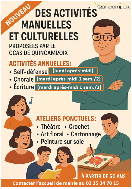 Le CCAS de Quincampoix est heureux de proposer aux séniors de 60 ans et plus, de nombreuses activités manuelles et culturelles tout au long de l’année.