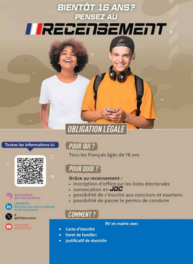 Depuis Janvier 1999, tous les jeunes Français, garçons et filles, doivent se faire recenser à la mairie de leur domicile, ou au consulat, s’ils résident à l’étranger. Cette obligation légale est à effectuer dans les 3 mois qui suivent votre 16ème anniversaire. La mairie (ou le consulat), vous remettra alors une attestation de recensement.