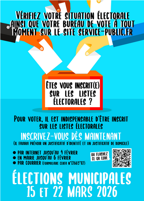 – L’inscription est possible jusqu’à 6 semaines du scrutin. Pour les élections municipales 2026, il sera possible de s’inscrire sur les listes électorales en ligne jusqu’au 4 février 2026 et en mairie jusqu’au 6 février 2026.