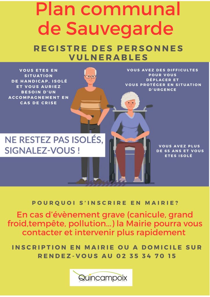 C’est pourquoi, la mairie de Quincampoix est chargée de recenser les personnes vulnérables et d’assurer la mise à jour des données collectées. Le registre des personnes vulnérables est un registre nominatif et confidentiel. Il comporte des informations relatives à l’identité, l’âge, l’adresse, les coordonnées téléphoniques et les personnes à prévenir en cas d’urgence.