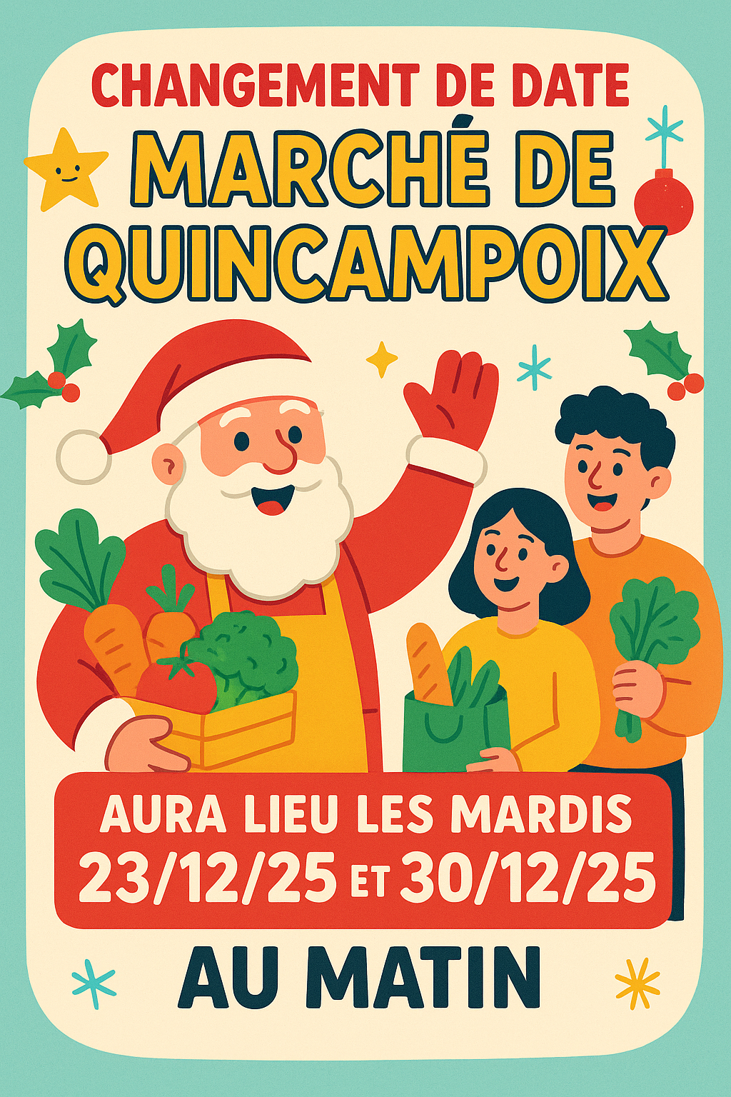 Le marché de Quincampoix sera avancé les mardis 23 et 30 décembre au matin. Passez vos commandes à l’avance auprès de vos commerçants !
