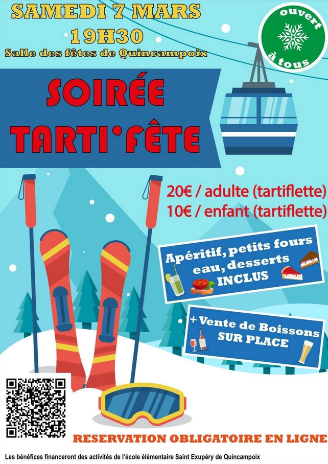 Une soirée sur le thème montagnard, repas tartiflette et soirée dansante avec DJ ! Organisée par les Parents d’élèves au profit de l’école Saint-Exupéry.