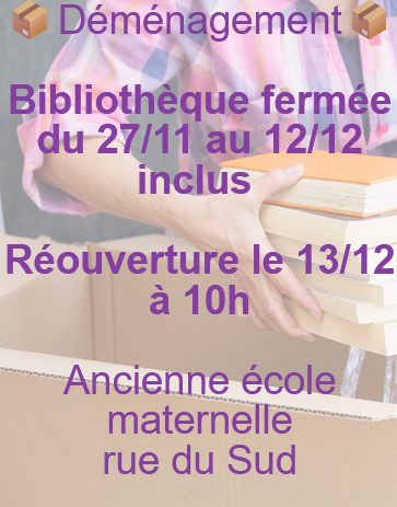 La bibliothèque municipale sera fermée du jeudi 27 novembre au vendredi 12 décembre inclus afin de déménager dans ses nouveaux locaux.